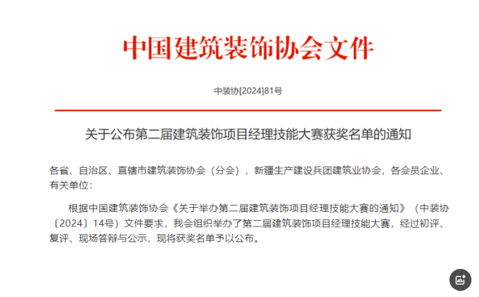 推進(jìn)建筑裝飾行業(yè)工業(yè)化、數(shù)字化、綠色化、裝配化轉(zhuǎn)型升級,中國建筑裝飾協(xié)會舉辦了(第二屆)建筑裝飾項目經(jīng)理技能大賽。 -
